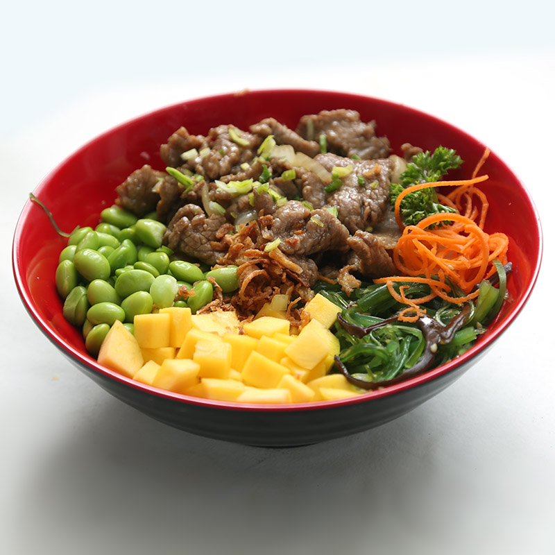 Boeuf Sauté, salade d'algue, mangue, oignon frit, edamamé ,sur un riz vinaigré.