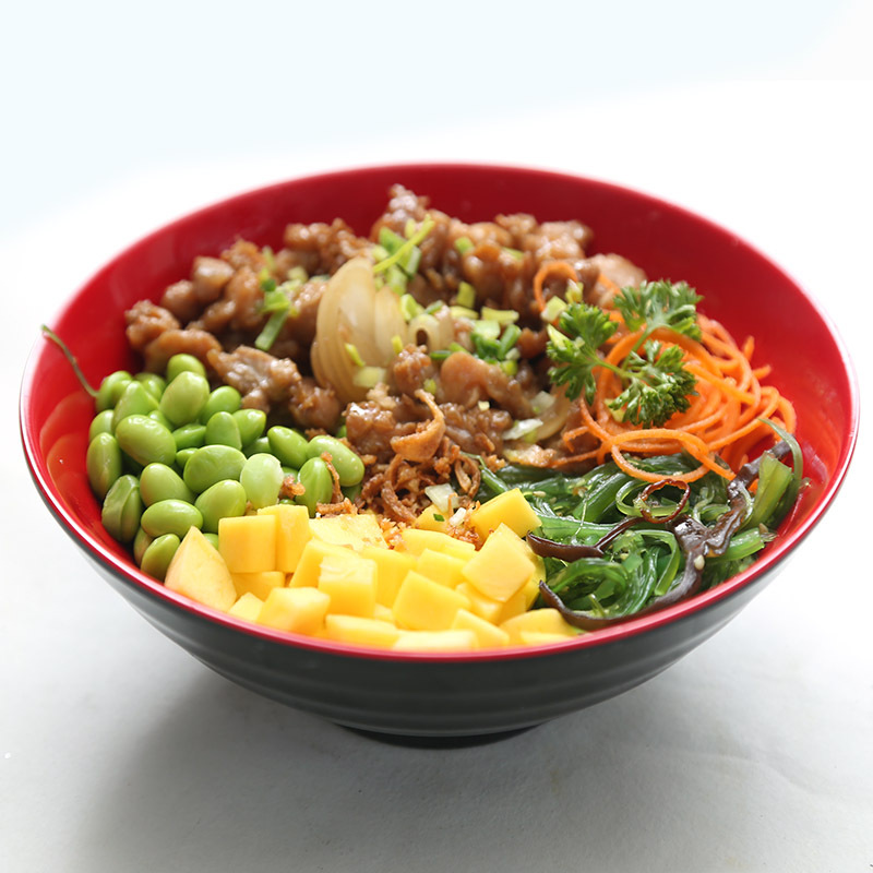 Poulet Sauté, salade d'algue, mangue, oignon frit, edamamé ,sur un riz vinaigré.