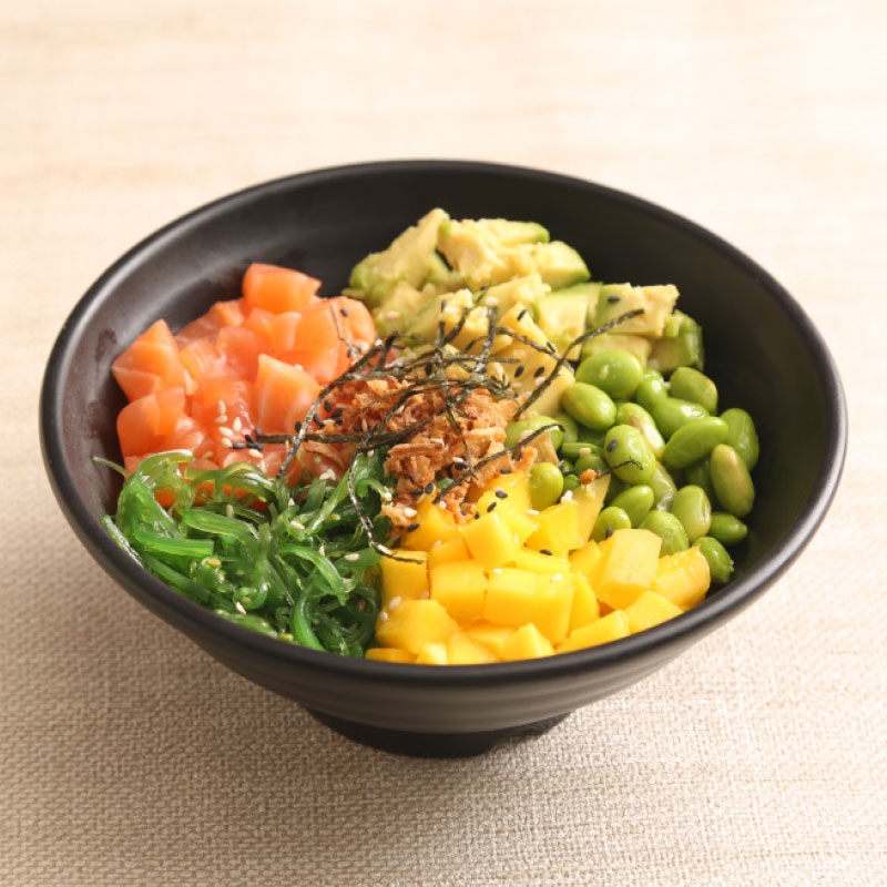 Saumon, avocat, salade d'algue, mangue, oignon frit, edamamé ,sur un riz vinaigré.
